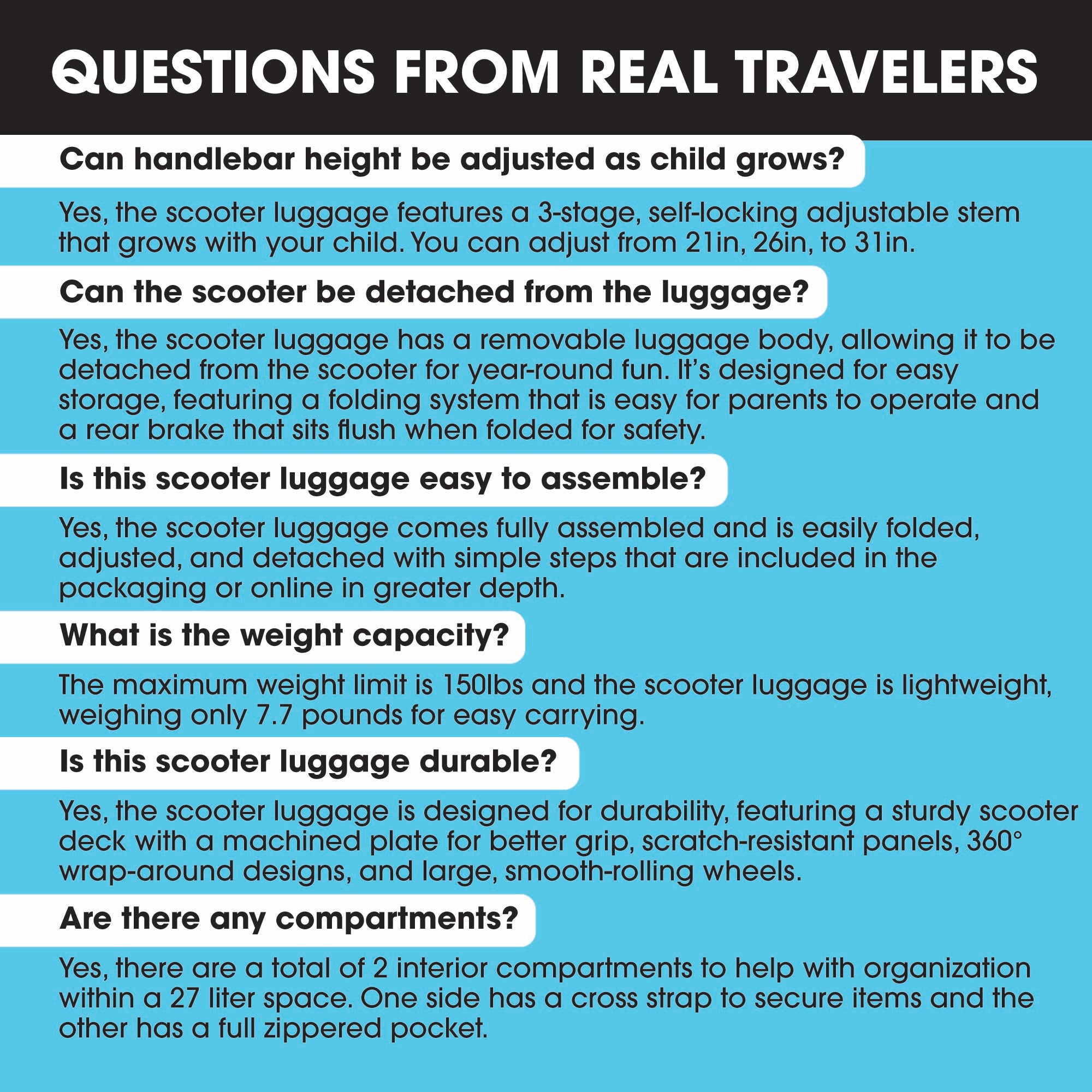 • GROWS WITH YOUR CHILD – Adjustable handlebar with three height levels and durable grips make this scooter suitcase perfect for kids of various ages and heights. For Ages 4+. 150 lb rider weight capacity.