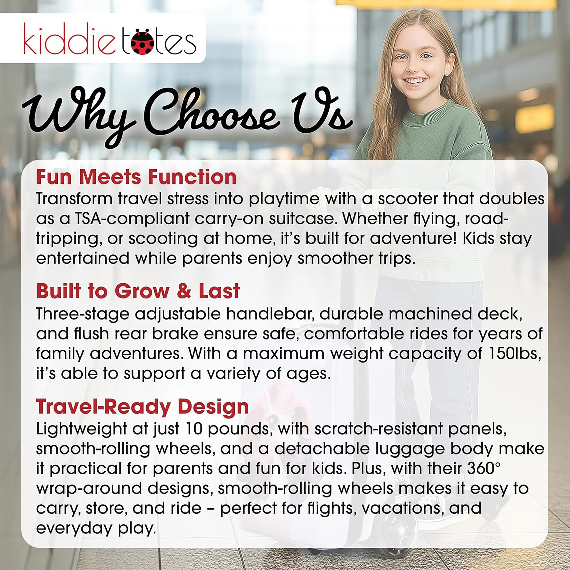 • GROWS WITH YOUR CHILD – Adjustable handlebar with three height levels and durable grips make this scooter suitcase perfect for kids of various ages and heights. For Ages 4+. 150 lb rider weight capacity.